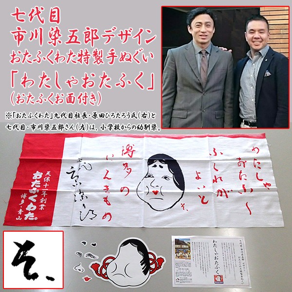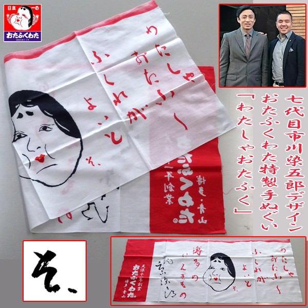 わたしゃおたふく・・・七代目・市川染五郎さん本人直筆デザイン手ぬぐい!歌舞伎ファン・市川染五郎ファンも・・・知る人ぞ知る極レア手ぬぐい限定入手! 人気歌舞伎役者七代目・市川染五郎さんデザインの超レアな手ぬぐいを入手!歌舞伎ファン・市川染五郎さんファンでも手にしている方は極わずかなレアアイテムを超限定販売!天保11年創業・老舗手作り木綿ふとん屋「おたふくわた」が、人気歌舞伎役者、七代目・市川染五郎さん本人直筆デザインで作る特製手ぬぐい!「おたふくわた」九代目社長・原田ひろたろう氏と七代目・市川染五郎さんは、小学校からの幼馴染。そんな御縁もあってこの特製手ぬぐいはできあがりました。染五朗さん本人が書いた直筆の文章とおたふく顔を、「注染ぼかし染め」という伝統技法の手染めで仕上げた手ぬぐい。・・・その名も「わたしゃおたふく」。歴史と伝統を重んじる両人の思いが詰まった極上の手ぬぐいに仕上がりました。■サイズ:約82x35cm