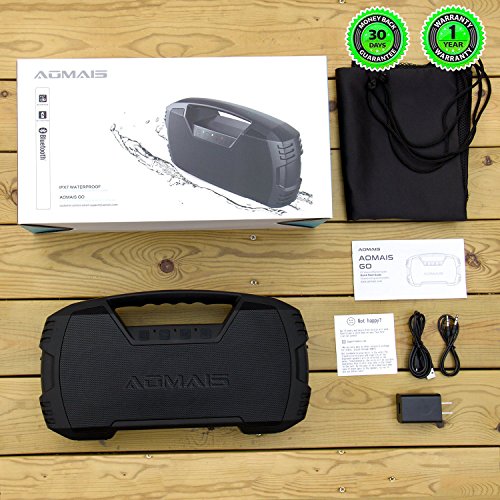 AOMAIS Go Bluetooth Indoor/Outdoor Speaker AOMAIS Go has rugged and durable strength, with good looks to match. IPX7 top waterproof rating and full volume makes AOMAIS Go great for hiking, beach, camping, poolside, or backyard use. Rich, clear 30W stereo sound lets the bass boom. TWS function lets you pair two speakers for a powerful 60W stereo surround sound. Long play times with our 7200mAh battery; recharges in a flash. Emergency power supply prevents fadeouts, no need to worry about your devices dying when you enjoy your music. Easy use with iPhone, tablets or other devices. Connect with 3.5mm jack for non-Bluetooth devices. Even use AOMAIS Go for Karaoke by plugging in an external 3.5mm Microphone
