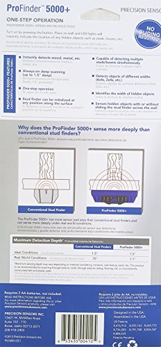Advanced Precision-Sense Technology senses the wall in multiple locations simultaneously to accurately determine the position of studs. Operates effectively even through difficult architectural construction features (such as wall and ceiling textures, uneven plaster thickness, uneven paint, and difficult wallpaper, thick walls, etc.) that can cause other detectors to fail.