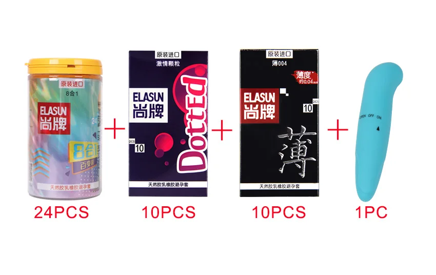 Quantity:24pcs/Bottle 8 In 1 +10pcs/Box Passion particles +10pcs/Box Ultra thin 004 +1pc Vibrator(Batteries not included)