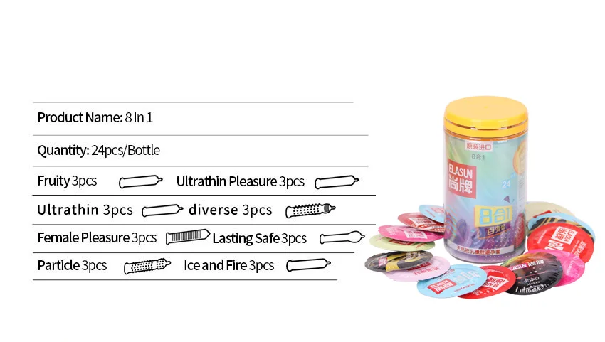Name:ELASUN 44PCS Latex Condom 8 Types Condoms Ice and Fire Dotted Pleasure for Men Safer Contraception Gift Vibrator