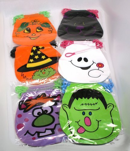 With these drawstring Halloween goody bags, it?s the more the merrier. With this package of 72, that is less than 17 cents per Halloween goody bag. The Drawstring Halloween Goody Bags come in 6 different designs; black cat, pumpkin face, witch, ghost, purple monster, and Frankenstein. Halloween treat bags are essential for your trick-or-treaters and party guests. Stuff these Halloween goodie bags full of candy and Halloween toys to pass out to ghouls and goblins at your door. Halloween buckets and cauldrons are ideal for kids going door-to-door to collect candy. And Halloween gift bags are essential for Halloween party guests and their party favors. 7 3/4 plastic bags Assorted Halloween designs include: black cat, pumpkin, ghost, witch, monster, and Frankenstein drawstring treat bags; Holidays, Halloween, Treat Bags; Sold as package of 72