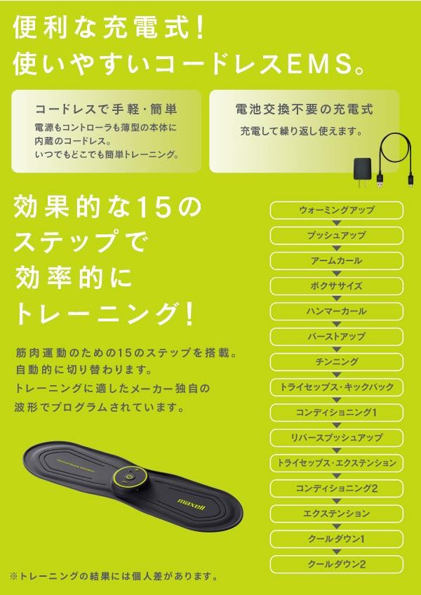 | 筋肉を低周波の電気刺激によって収縮させるEMS運動器です。気になる部位を広範囲に包み込み、部位全体の筋肉運動をサポート。効率的な運動が可能です。コードレスなので、身体に貼るだけでいつでもどこでもトレーニングができます。 |