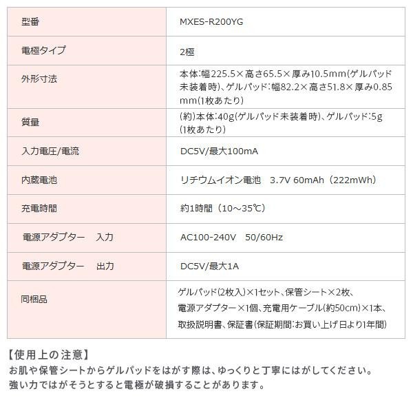 | 付属品 | ゲルパッド(2枚入)×1セット、保管シート×2枚、電源アダプター×1個、充電用ケーブル(約50cm)×1本、取扱説明書、保証書(保証期間:お買い上げ日より1年間) |