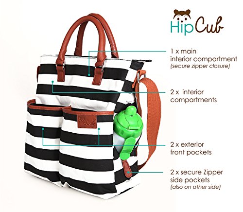 - Feature : "WHERE FASHION MEETS PRACTICALITY" - We made it our mission to create a diaper bag that was fashionable enough for a designer catwalk, yet practical enough for an everyday Mom or Dad / INCLUDES MATCHING CHANGING PAD & STROLLER STRAPS - Hip Cub Diaper Bags simply clip and hang onto strollers, making it super easy to access things quickly! / SAFE, SECURE & SPACIOUS! - 7 pockets including 1 main compartment with secure zipper closure, 2 side pockets, perfect for bottles and feeding items. 2 external pockets great for wet things and 2 internal compartments / COMFORTABLE & TRENDY - We set out to design the most comfortable, useful and best diaper bag on the market, but without compromising on 'style' by making it too large or bulky / SO IMPRESSIVE IT EVEN "CARRIES" A 100% GUARANTEE! - At Hip Cub we are so confident that you will love our diaper bags that we offer a lifetime satisfaction 100% money back guarantee!