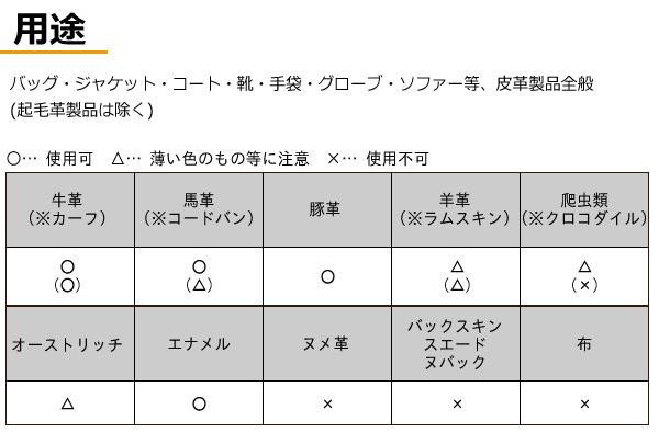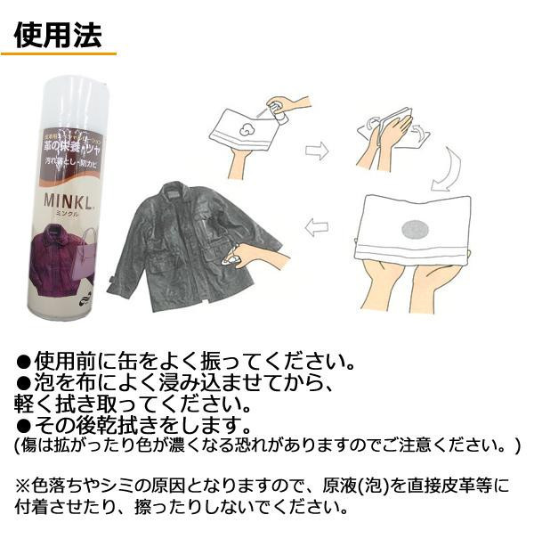 皮革製品のお手入れに!!ミンクオイルのスペシャルローションです。ミンクオイルを補給することにより、革本来のしなやかさと自然な光沢を引き出します。バッグ、ジャンバー、ソファーなど身近な皮革製品にも使用可能。防カビ剤含有なので、長期保存の際にもオススメです。無色の泡タイプなので、どのような色にもご使用いただけます。 |
