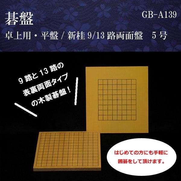| 新桂(アガチス材)の卓上用両面盤です。片面が9路、もう一方が13路と両面使用できる碁盤です。テーブルの上でお気軽にお使いいただけ、初心者の方や練習用としてお勧めです。 |