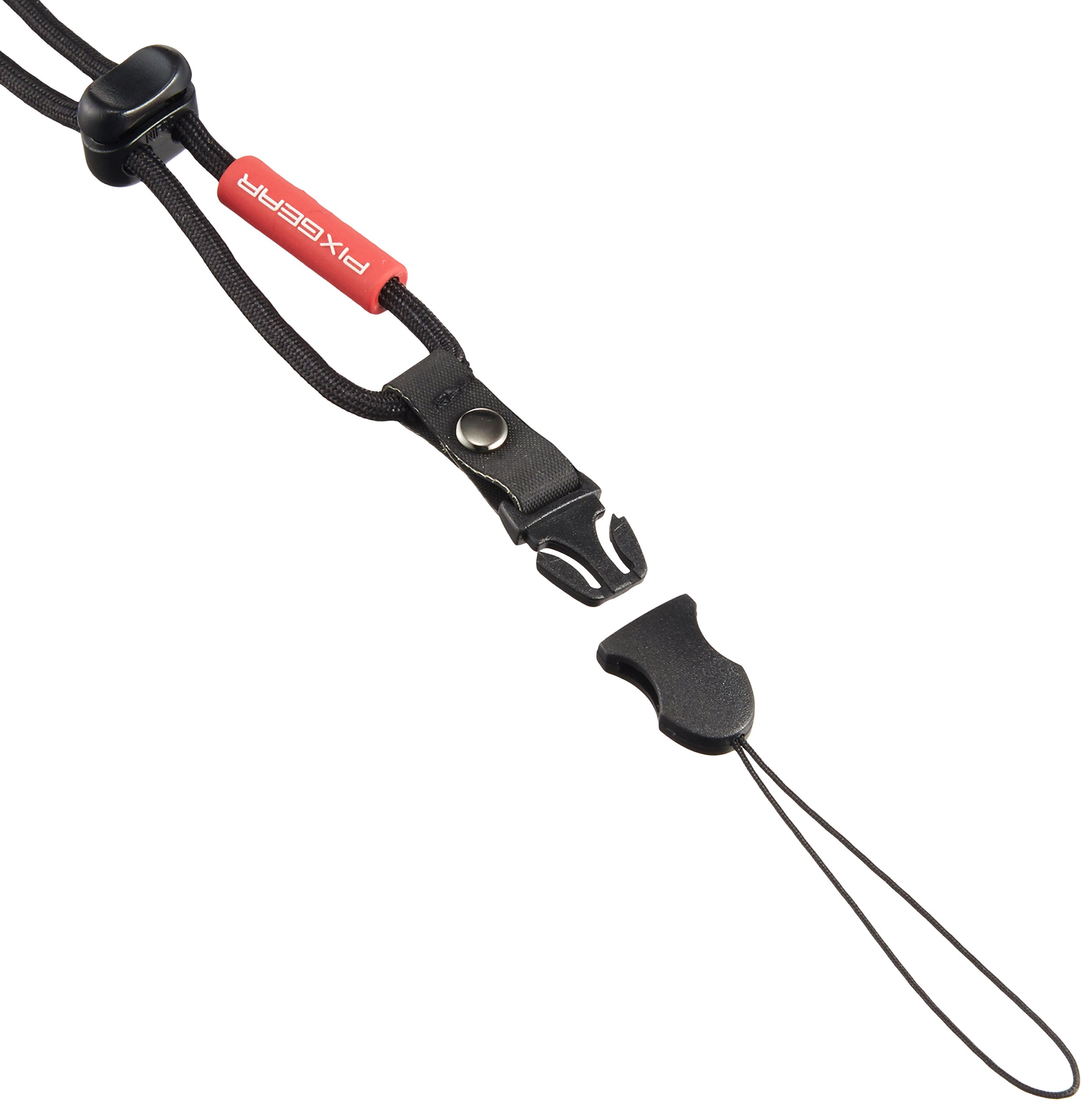 Neck strap that allows easy attachment and detachment of camera and strap with camera buckle buckle, and length adjustment by cord lock.