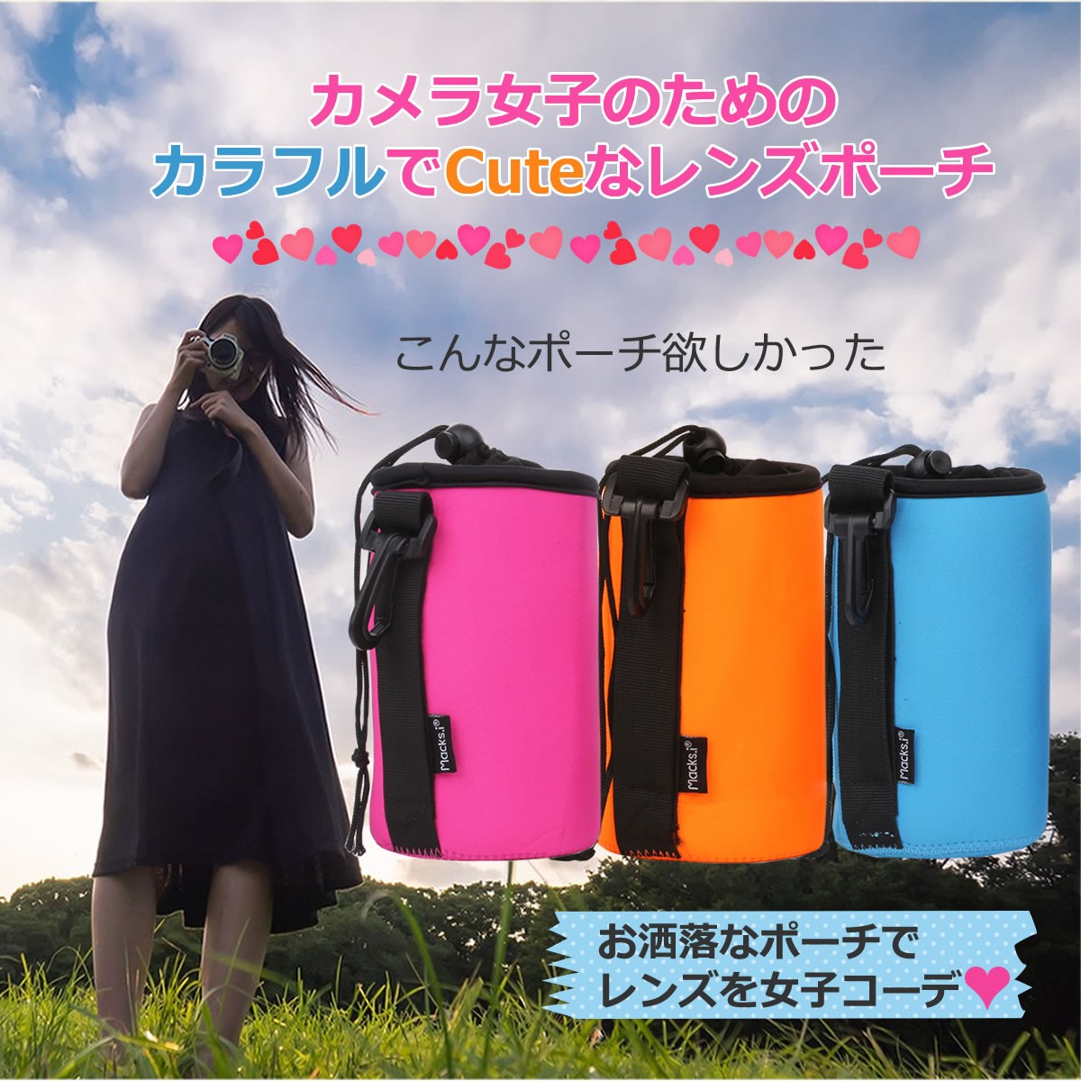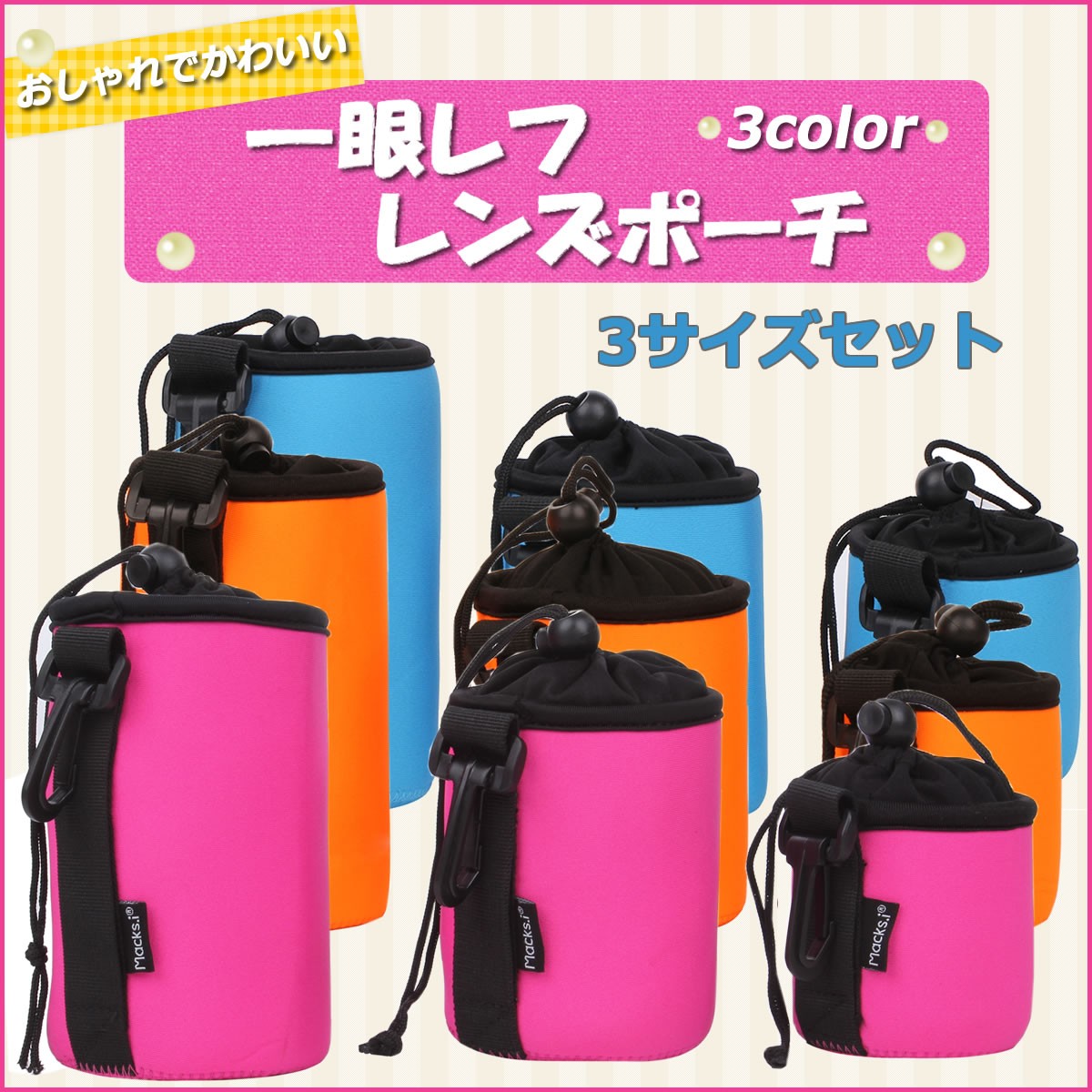 カメラ女子のためのおしゃれで可愛いカラフルレンズポーチの3サイズセット♪