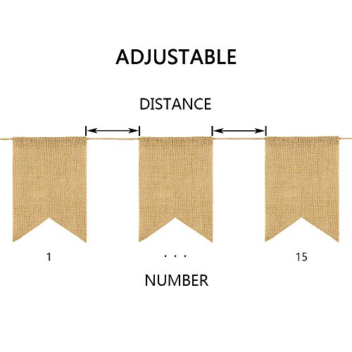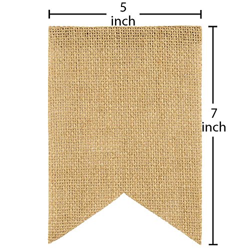 -. Feature : Package with 15pcs swallow-tailed burlap banners stringed by jute rope, each flag is 7" H x 5" W / Perfect Blank slate can use paint, fabric or Cardboard to DIY any message / Flags' Number and distance can be freely adjusted / Great for kids party, wedding, birthday, baby shower, Country party, celebrations and decorations of any occasion / Each flag is presented a perfect feature to customer of its perfect manufacture and quality inspection