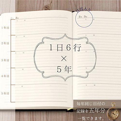 1ページに同じ日にちで5年分書ける日記帳です。1年前の記録を振り返りながら書く事が出来ます。保存に適したハードカバー付き。