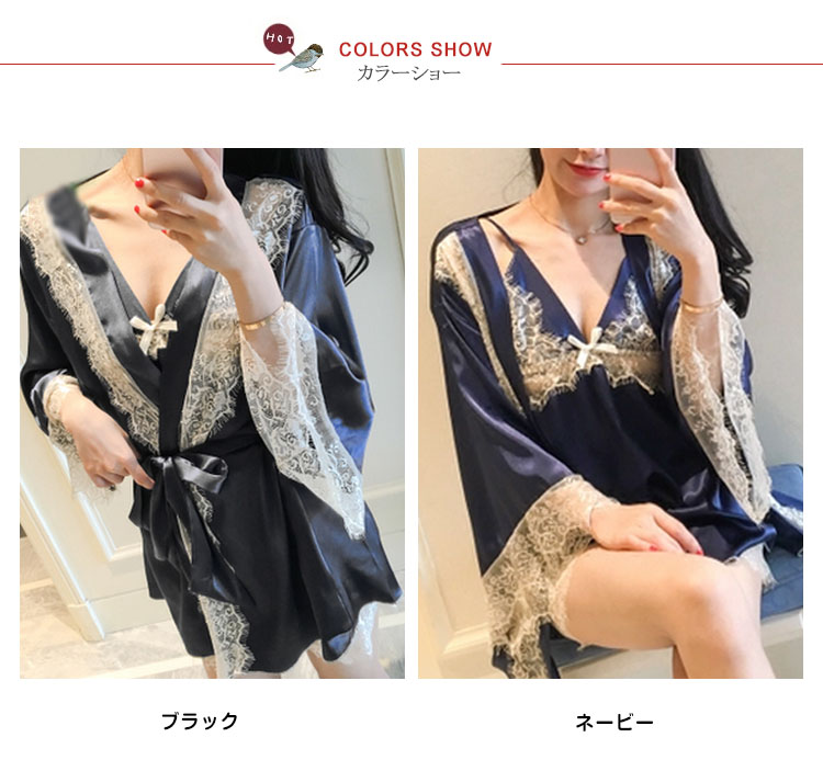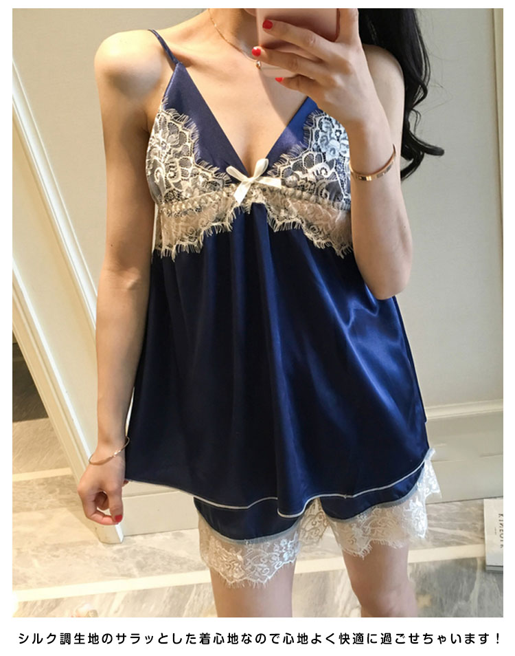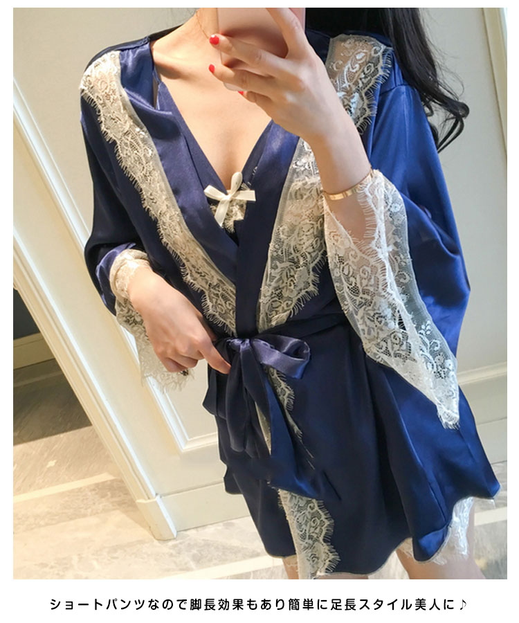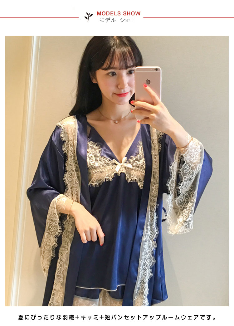 | たっぷりレース使いセットアップルームウエアが新登場♪夏にぴったりな羽織+キャミ+短パンセットアップルームウェアです。シンプルな無地なので派手さもなく年齢問わずカジュアルな印象に♪パンツも動きやすいウエストゴムでラクチンショートパンツなので脚長効果もあり簡単に足長スタイル美人に♪シルク調生地のサラッとした着心地なので心地よく快適に過ごせちゃいます!ご家族やお友達、恋人へのプレゼントとしてもオススメです! | |