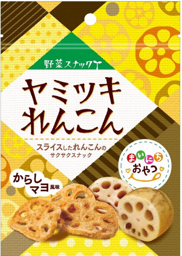 スライスしたれんこんを真空フライにし、からしマヨ風味に仕上げたサクサクスナックです。野菜の旨味を丸ごと食べられる美味しいお菓子です。 |