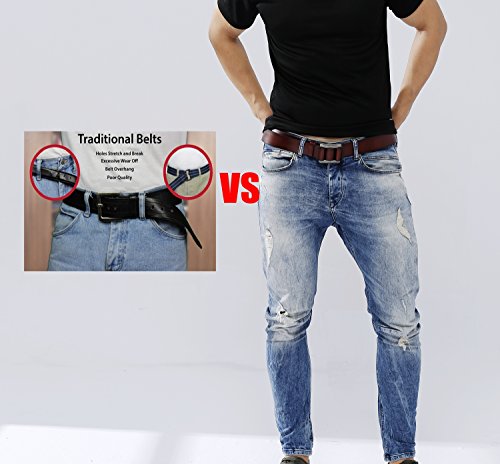 -. Feature : Genuine Leather Material : Our belts is 100% full-grain leather, perfect and flawless, no blemishes excellence of craftsmanship, Matching daily outfits perfectly / No Holes Design : Our men's Belts with No more worn-out, stretched-out, augmented, awkward belt holes to deal with, Instead a modern easy buckle conforms to your precise waist size / Perfect Fit : Most comfortable leather belt you'll ever wear. Precise, secure fit provides a smooth/Tight and is easy to adjust, suitable for any waist / GIFT BOX : Our leather belt is warped in a luxury gift box, excellent present for any your lovers and friends as a Christmas and anniversary gift / Quality Guarantee : We promise 180 days free exchange without reason and 360 days warranty. Our belt is 1.5"(3.8cm) wide and fit all jeans and most pants