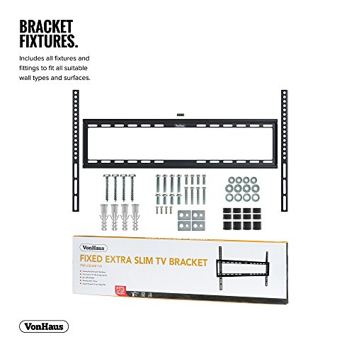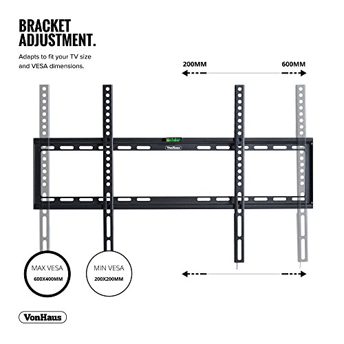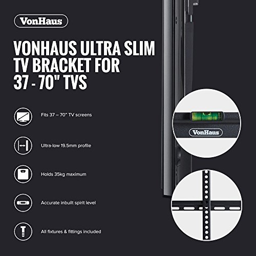 -. Binding : Electronics -. Brand : VonHaus -. Color : Black -. EAN : 5060192524833 -. Feature : Max VESA 600x400. Compatible VESA dimensions: 200x200; 300x300; 400x200; 400x400; 600x400 / Suitable for many makes and models of LCD, LED & Plasma screens between 37" - 70" up to 77lbs / Ultra-slim profile - sits just 19.5mm from the wall. Heavy duty reinforced steel construction with lateral shift feature / Quick and easy to install - comes complete with full instructions and required fitting hardware / Super economy slim fixed TV wall mount -. Label : Designer Habitat -. Manufacturer : Designer Habitat -. Model : 05/091 -. MPN : 05/091 -. NumberOfItems : 1 -. PackageQuantity : 1 -. PartNumber : 05/091 -. ProductGroup : Home Theater -. ProductTypeName : AV_FURNITURE -. Publisher : Designer Habitat -. Studio : Designer Habitat -. Title : VonHaus Ultra Slim TV Wall Mount Bracket for 37 -70" LCD, LED, 3D & Plasma Screens - Max. VESA 600x400, 77lbs Weight Capacity