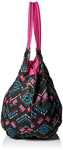 Printed cotton canvas beach tote with leather logo patch and magnetic snap closure at top opening
