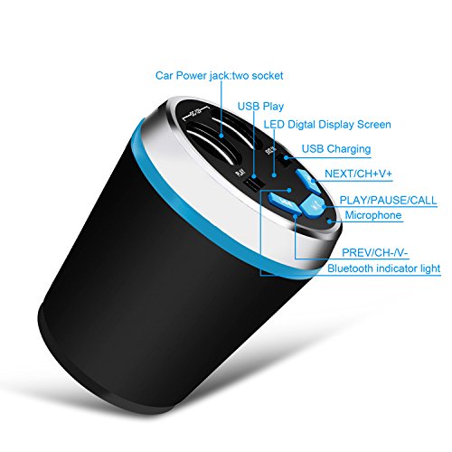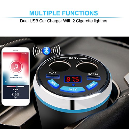 1, Bluetooth FM transmitter: Pair with your phone,and connecting with your car stereo system via FM transmitter. Then you can make phone call or play music directly from your phone. 2, Dual Cigarette Lighter Socket: Convert your car cigarette lighter from 1 into 2 car splitter sockets, allow you plug in more different devices at a time. 3, Dual USB Ports: Dual USB charging ports with 3.1A total output enable you to charge a tablet and phone simultaneously. 4, Multi-Level Protection: Built-in protective circuits protects against over-current, short-circuit, over-temperature and over-charging.