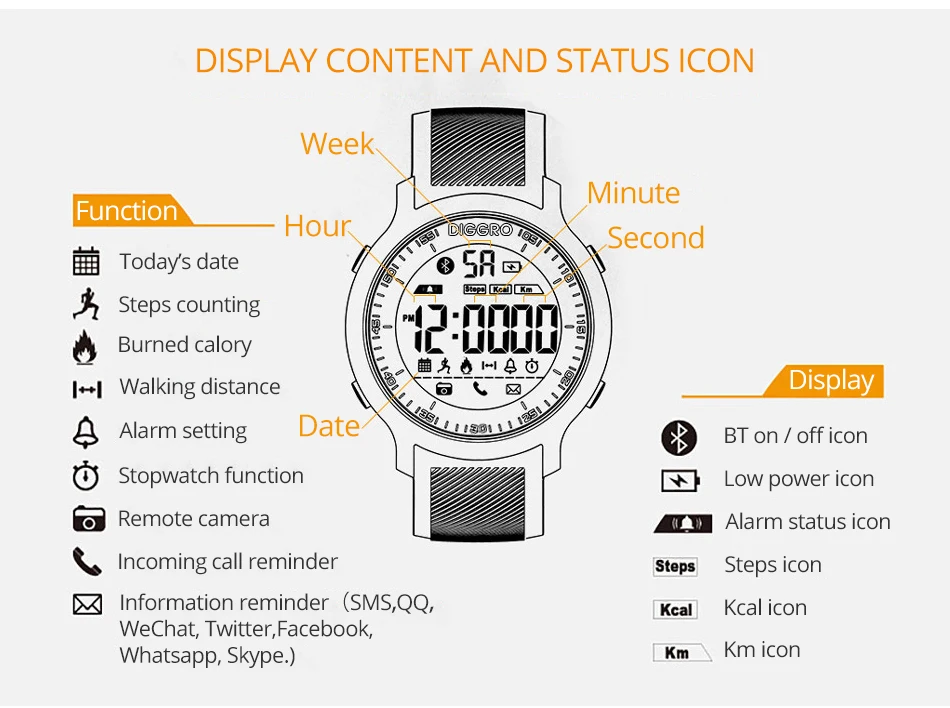 Function:Message Reminder,Answer Call,Passometer,Alarm Clock,World Time,Countdown,Interactive Music,Fitness Tracker,Call Reminder,Month,Calendar,Remote Control,Sleep Tracker