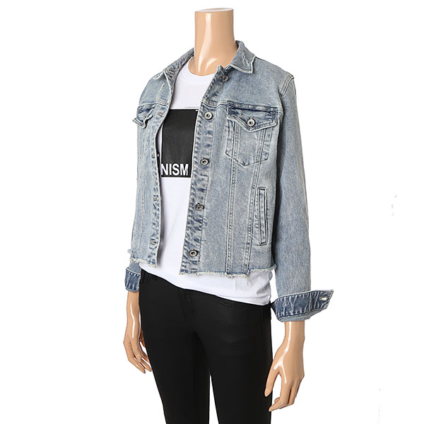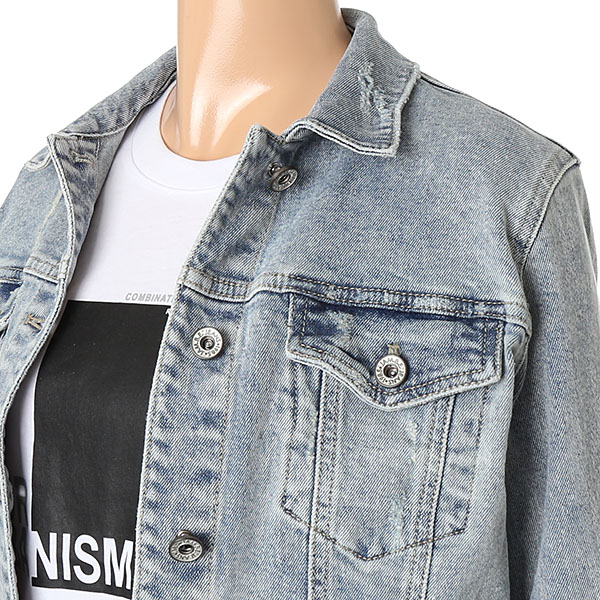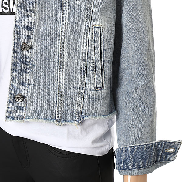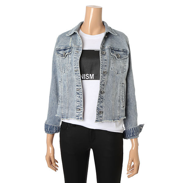 밝은 MB톤 인디고 칼라에 은은한 스노우 구제워싱의 크롭기장의 트렌디한 여성용 데님 쟈켓 데님 스타일.