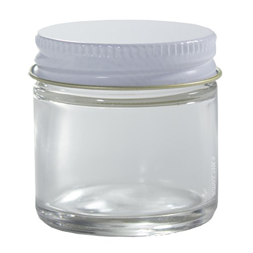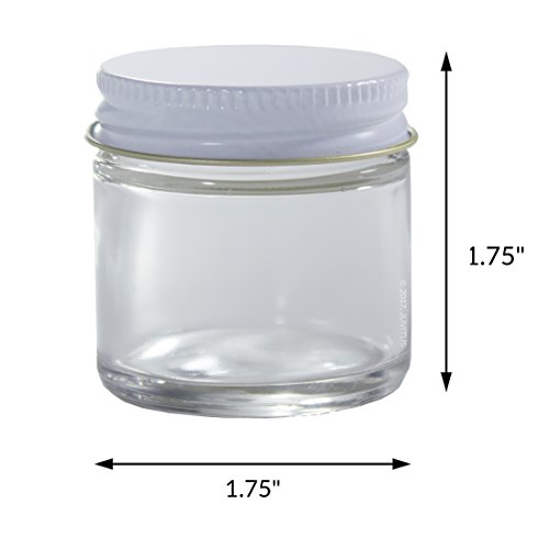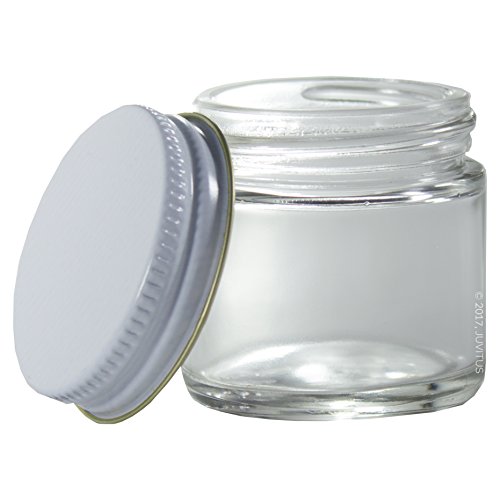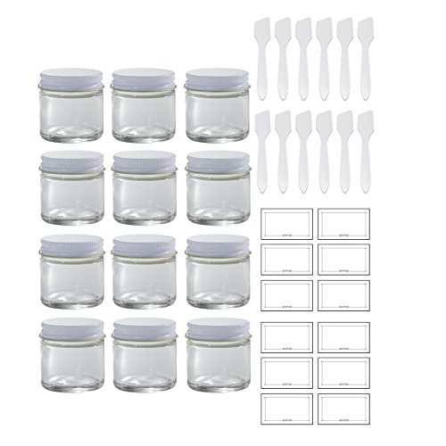 - Includes 12 - 30 ml / 1 oz Clear Glass Straight Sided Jars with White Metal Lids + Spatulas and Labels