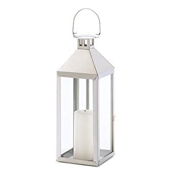 -. Feature : Uptown glamour abounds in this shining silver hurricane lantern. Add a colorful pillar candle inside to turn this dramatic accent into a decoration that glows with distinction! Weight 3.2 lbs. 5 3/4" x 5 3/8" x 15" high; 18 1/2" high hanging loop on top. Stainless steel and glass. Candle not included. / Free shipping with tracking. / Thank you for visiting eTreasures.