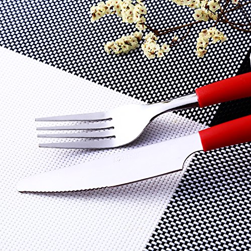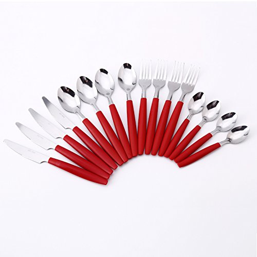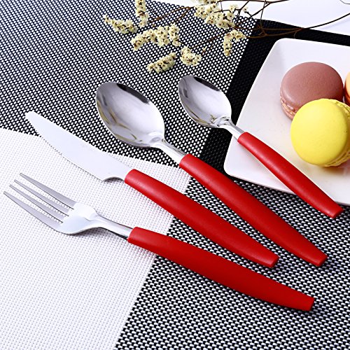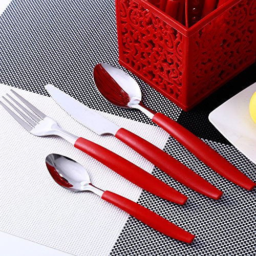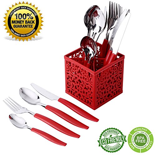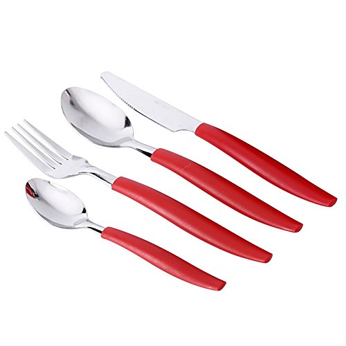 Siverware Set Moxinox 16-Piece Stainless Steel Flatware Set Plastic Handle Service for 4 with Plastic Caddy Dinnerware Tableware Cutlery (Red)