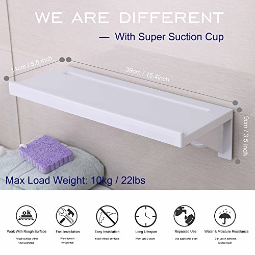 【Size & Super Loading Weight 】 - Size of this suction cup shower bathroom shelf is 15.3"(L) x 5.5"(W) x 3.5"(T),suction cup diameter is 2.5".With the super suction cups,the storage rack can hold up to max 22 lbs / 10 kg.(please do not over load)