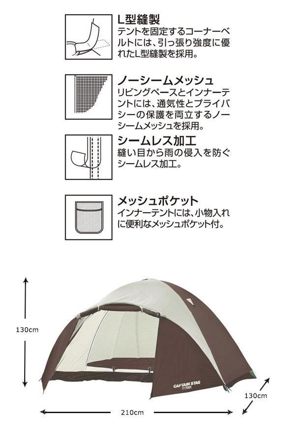| 素材・材質 | フライ:ポリエステル70D(PU2000mm) インナー/ウォール:ポリエステル(通気性撥水加工)、グランドシート:ポリエステル150D(PU2000mm) メッシュ:ポリエステルノーシームメッシュ ポール:Φ8.5mm(7001ジュラルミン) |