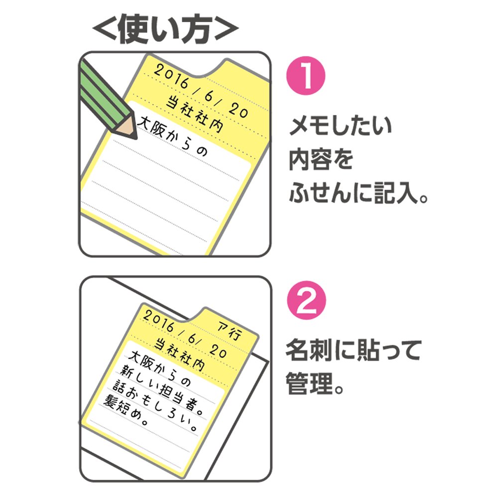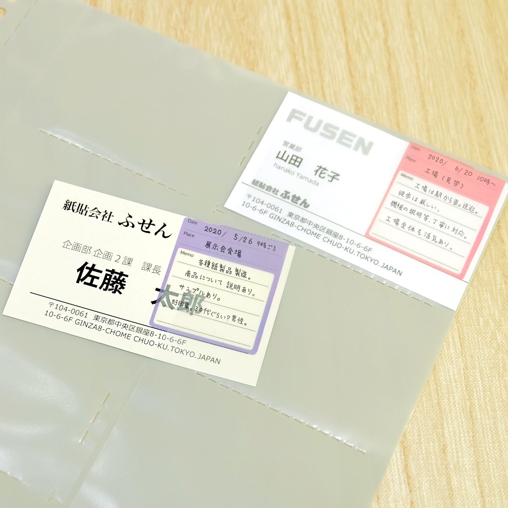 How to use is very simple, write "Date card exchange date", "Place", "Memo" on semi-transparent film clip, paste directly on the business card and organize it.
