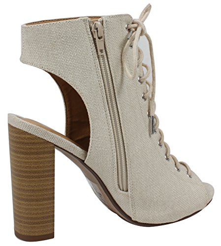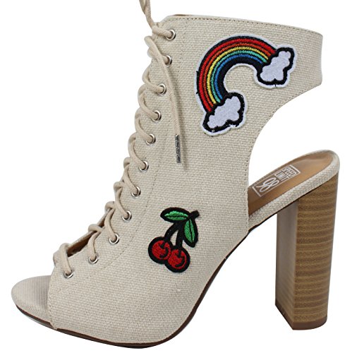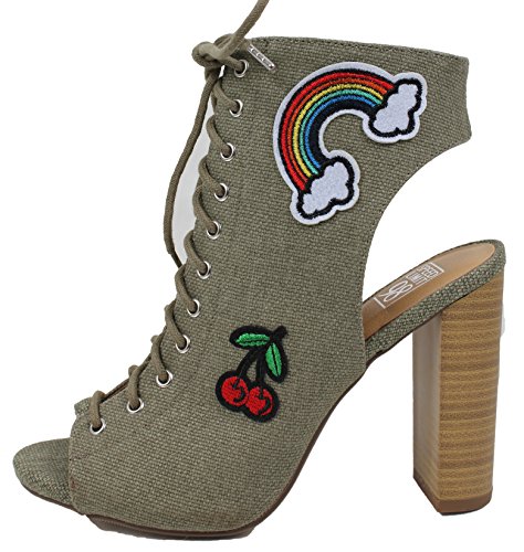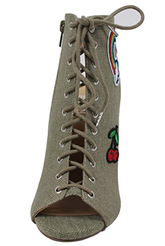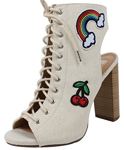 Product Description Patch ankle bootie featuring open toe, canvas material, lace up with inner side zipper for easy on/off, and stacked heel approx. 4 1/2". ( size 7 measurements) 0