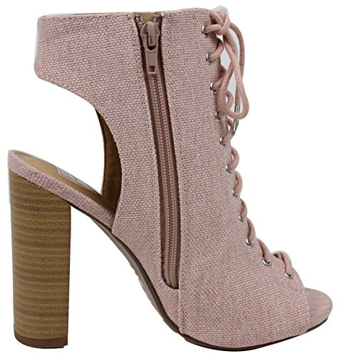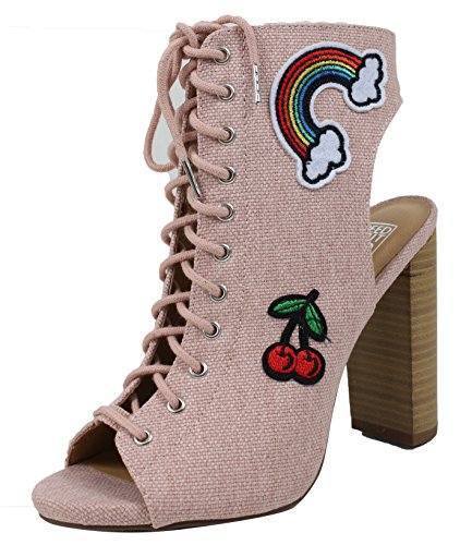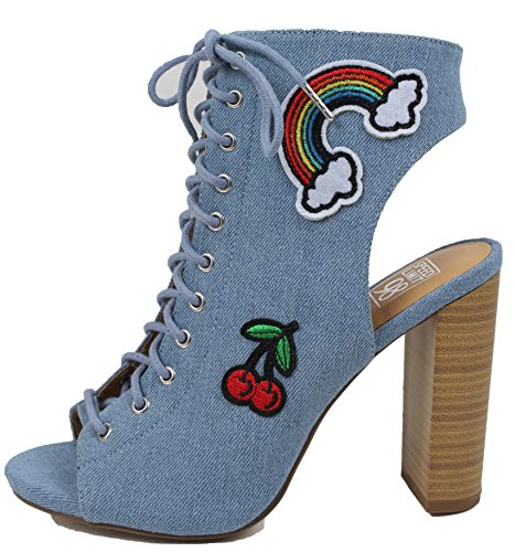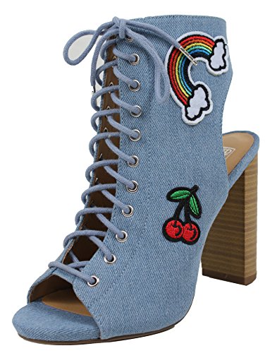 Speed Limit 98 Women's Peep Toe Lace up Patch Open Back Stacked Heel Ankle Bootie, Blue 6 M US