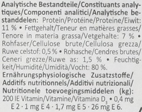 素材構成:蛋白質11 %、脂肪7 %、粗繊維 0.5 %、粗灰分 1.5 %、水分 80 %