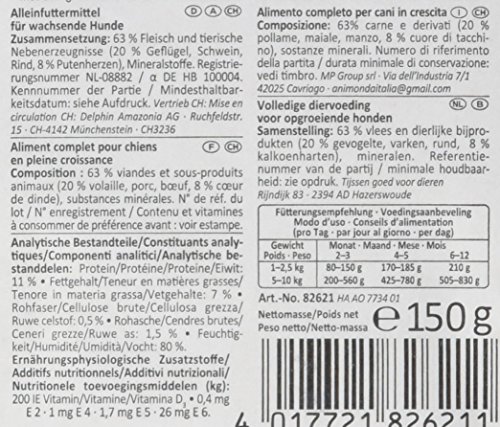 原材料:肉類(鳥肉、豚肉、牛肉、七面鳥の心臓)、ミネラル、ビタミンD3、 ヨウ素、銅、マンガン、亜鉛
