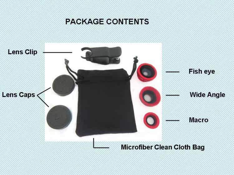 Accessories include: fish eye lens is a wide-angle lens, and a lenscover, 2, universal clamp a bag, a!