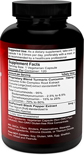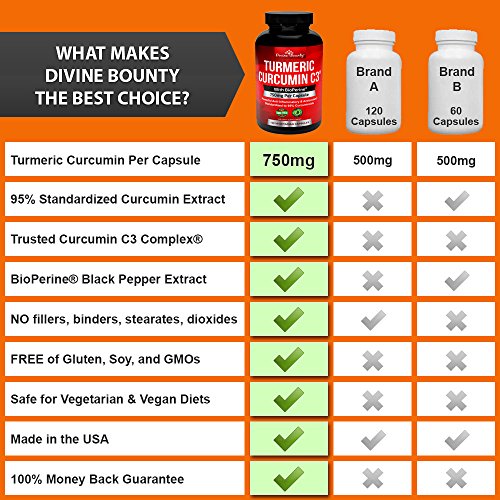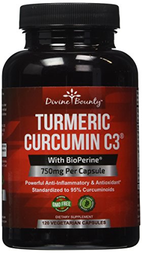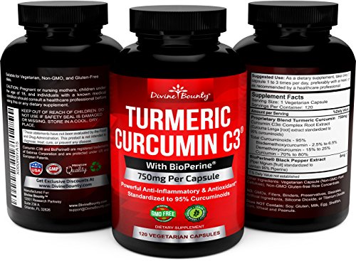-. Binding : Health and Beauty -. Brand : Divine Bounty -. EAN : 0738759842199 -. Feature : 50% MORE POTENT, BEST VALUE - Our Turmeric Curcumin C3 Complex with BioPerine formula is the most potent on the market. A highly POTENT 750mg of Curcumin per capsule (most other brands are only 500mg per capsule). / HIGHEST QUALITY INGREDIENTS - Not only is our tumeric curcumin supplement more potent, we use patented Curcumin C3 Complex. It is then combined with the patented black pepper extract BioPerine (5mg) for increased absorption and bioavailability. Curcumin with black pepper is essential in good curcumin supplements. We only use the best, because you deserve the best! / STANDARDIZED 95% CURCUMINOIDS - Normal turmeric only contains 2-6% curcumin. Yet studies show most of the health benefits come from the curcumin found inside. Beware of 'turmeric curcumin' formulas that simply contain a high dose of regular turmeric that only contain 2-6% curcumin. We use Curcumin C3 Complex because it's standardized to 95% curcuminoids, which means you're getting a highly potent dose of concentrated curcumin (not just regular turmeric). / FEEL THE DIFFERENCE GUARANTEE - We stand behind our tumeric curcumin supplement and are proud to have the best formula on the market. Give our tumeric pills a try and if you don't feel any difference, we'll give you your money back - no questions asked! It's a completely risk free Amazon Prime Deal / SAFE, PURE & MADE IN USA - Many competitors include ingredients that are harmful or you do not need. Our formula is Gluten FREE and has No GMOS, binders, fillers, preservatives, artificial ingredients or stearates. There is also no soy, milk, egg, shellfish, wheat, peanuts or any other ingredients that shouldn't be in there. Best of all, it's made in a FDA approved facility following strict GMP guidelines to ensure purity and potency. -. Label : Divine Bounty -. LegalDisclaimer : These statements have not been evaluated by the FDA. This product is not intended to diagnose, treat, or cure any disease. Curcumin C3® is a registered trademark of Sabinsa Corporation and protected under US Patent No. 5,861,415 and European Patent No. EP0839037. BioPerine® is a registered trademark of Sabinsa Corporation and protected by US Patents #5,536,506, #5,744,161 and #5,972,382, and #6,054,585. -. Manufacturer : Divine Bounty -. PackageQuantity : 1 -. ProductGroup : Health and Beauty -. ProductTypeName : HEALTH_PERSONAL_CARE -. Publisher : Divine Bounty -. Studio : Divine Bounty -. Title : Turmeric Curcumin C3 with BioPerine Black Pepper Extract - 750mg per Capsule, 120 Veg. Capsules - GMO Free Tumeric, Standardized to 95% Curcuminoids for Maximum Potency -. UPC : 738759842199