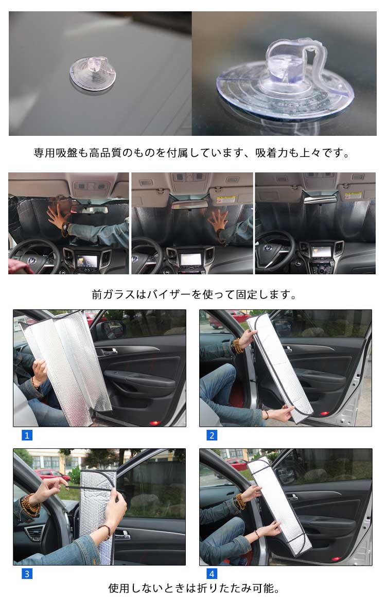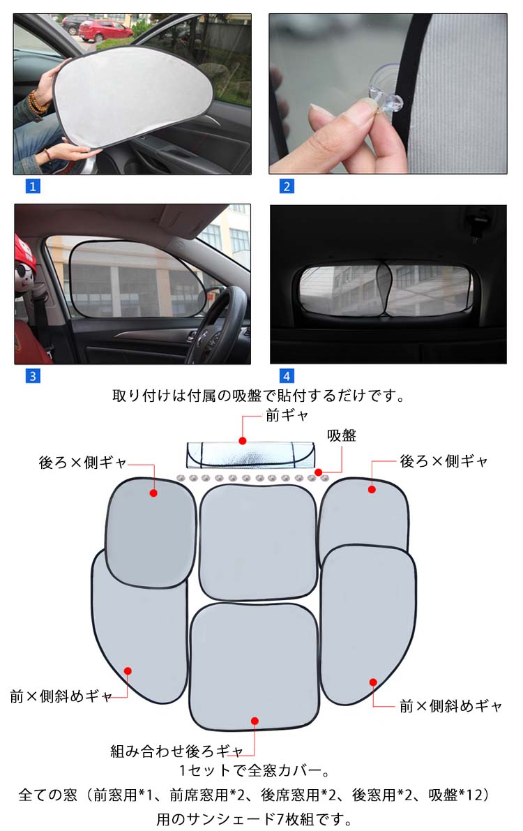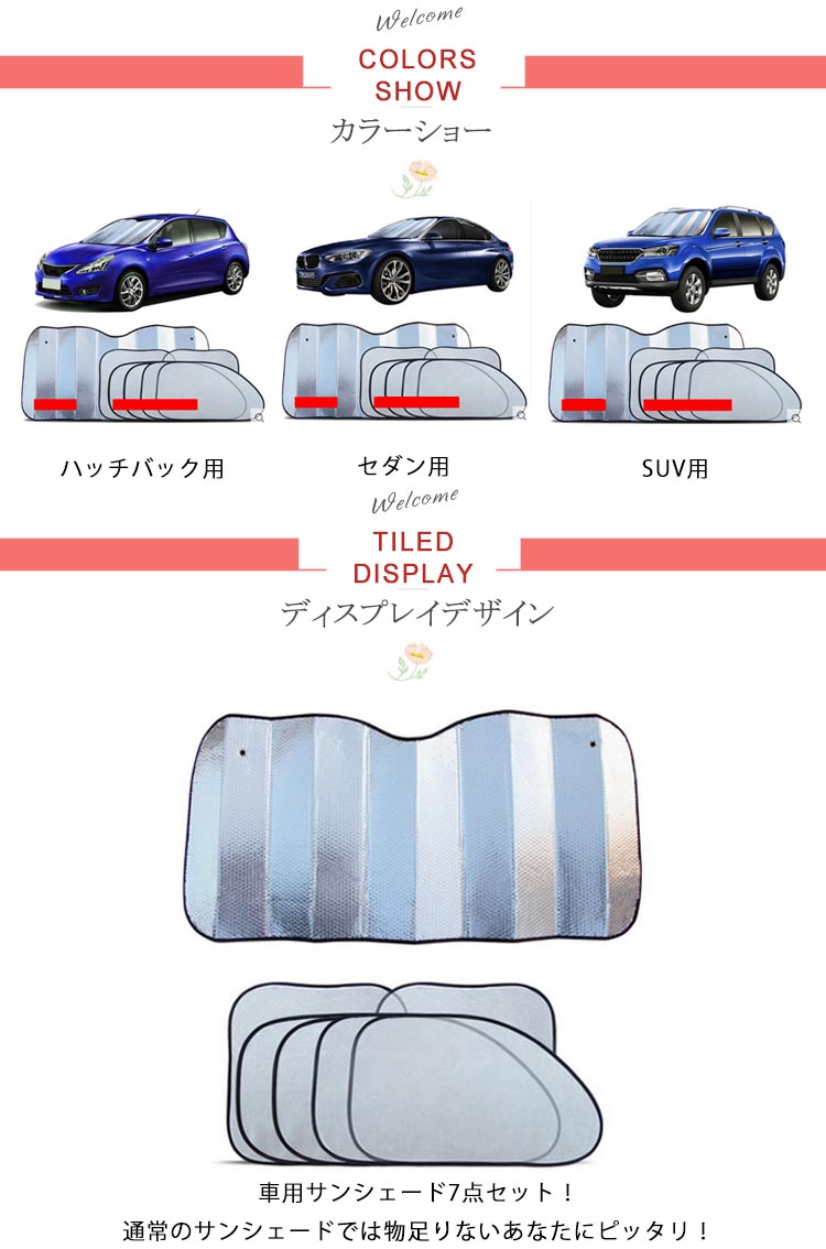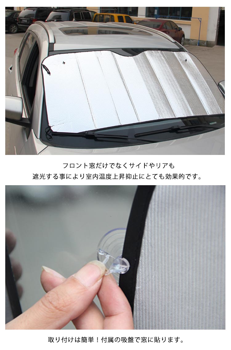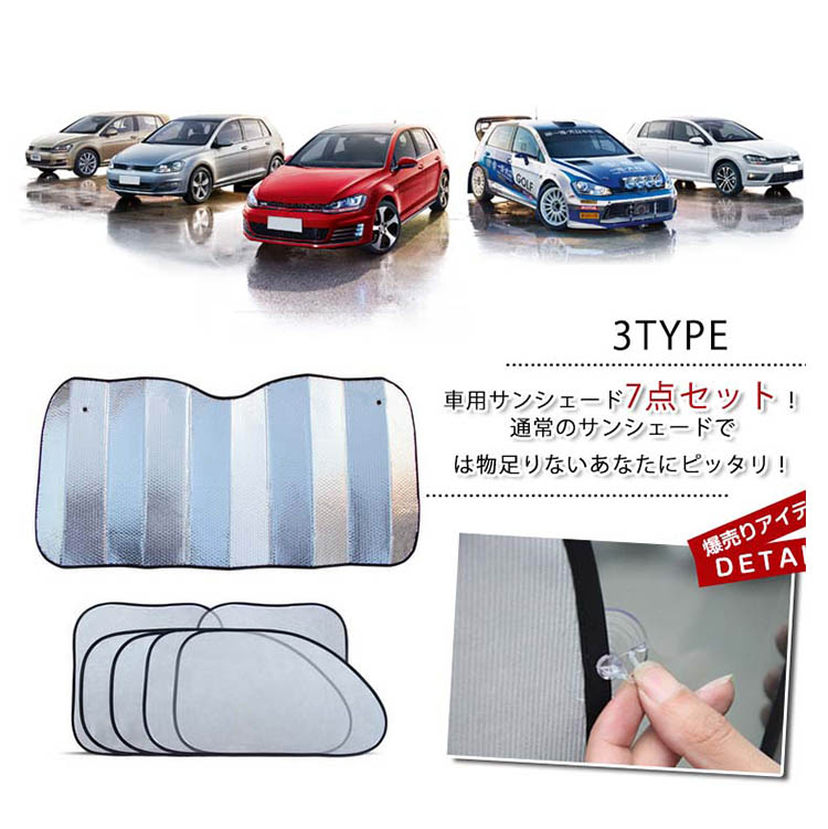 | 車用サンシェード7点セット!通常のサンシェードでは物足りないあなたにピッタリ!フロント窓だけでなくサイドやリアも遮光する事により室内温度上昇抑止にとても効果的です。取り付けは簡単!付属の吸盤で窓に貼ります。 | |