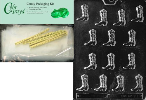 Cybrtrayd Mdk25G-K016 Cowboy Boots Kids Chocolate Candy Mold with Packaging Bundle, Includes 25 Cello Bags, 25 Gold Twist Ties and Chocolate Molding Instructions