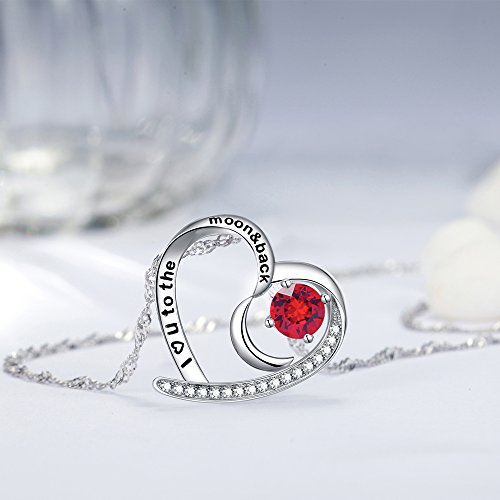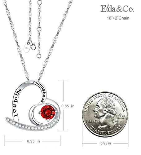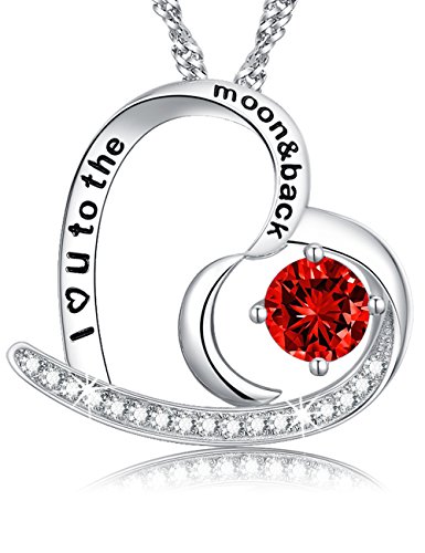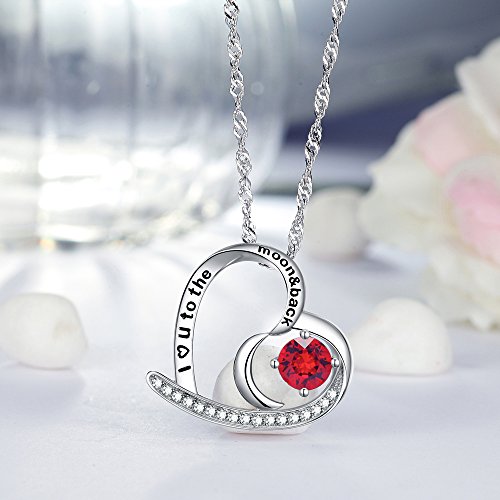 superior quality, 18K white gold plated over sterling silver, this delicate Red Garnet January Birthstone Love Heart Moon Necklace and 20" Singpore chain will never let you down.