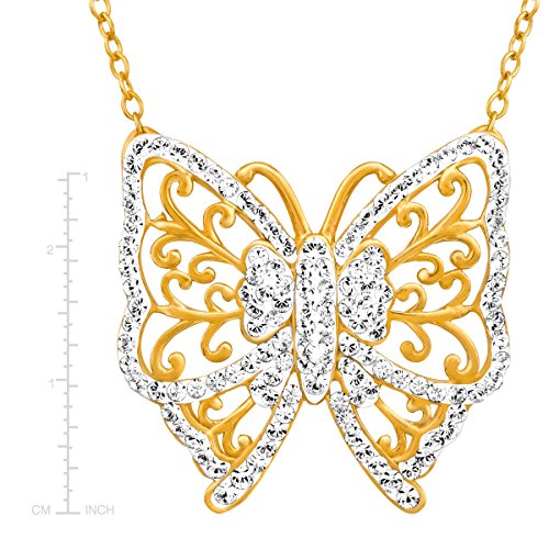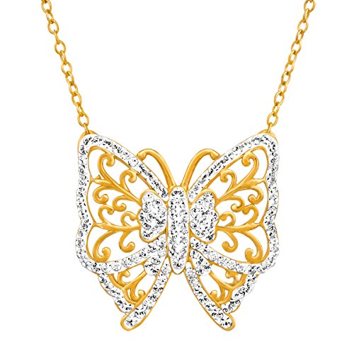 Express your love for butterflies with this statement necklace! Necklace features a butterfly with unique wing details embellished with round-cut, white Swarovski crystals, all crafted in 18K yellow gold over sterling silver. An 18K yellow gold over sterling silver cable chain finishes the look. Piece measures 1 1/4 by 1 1/4 inches with a total length of 18 inches.Feature