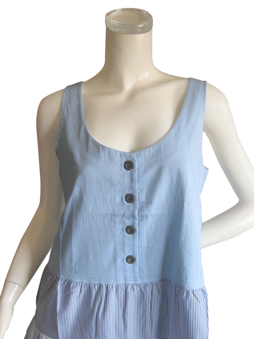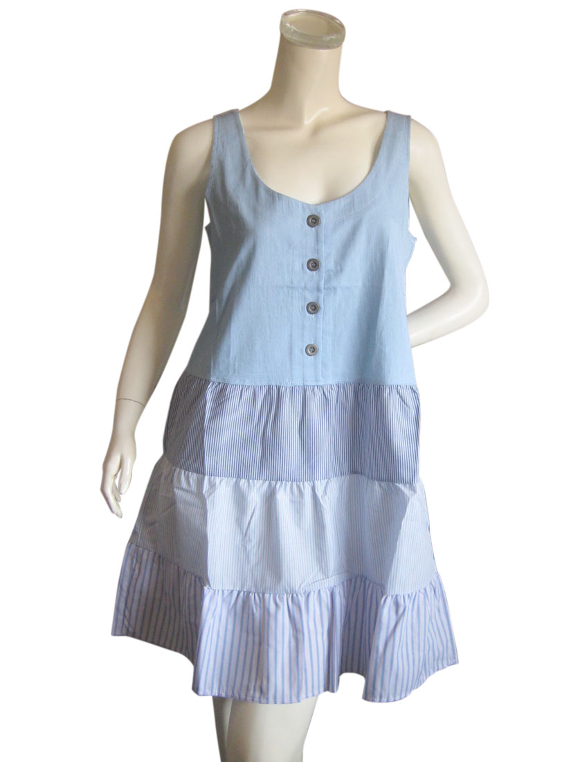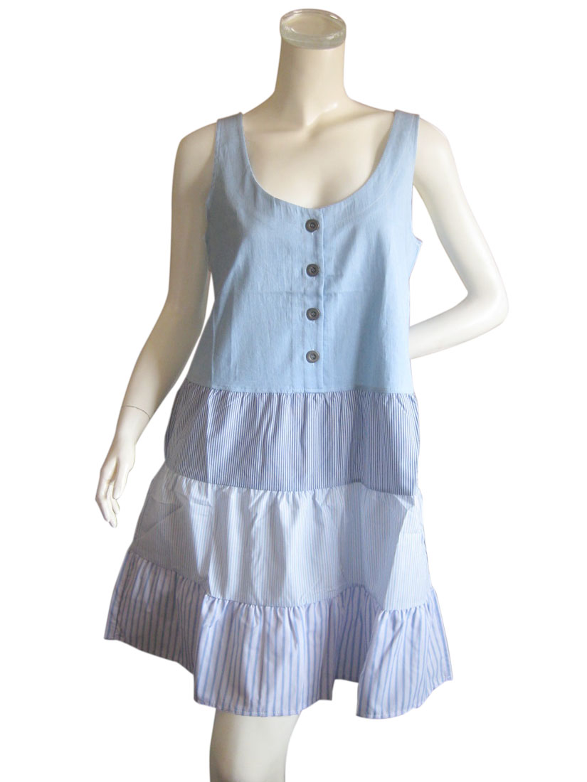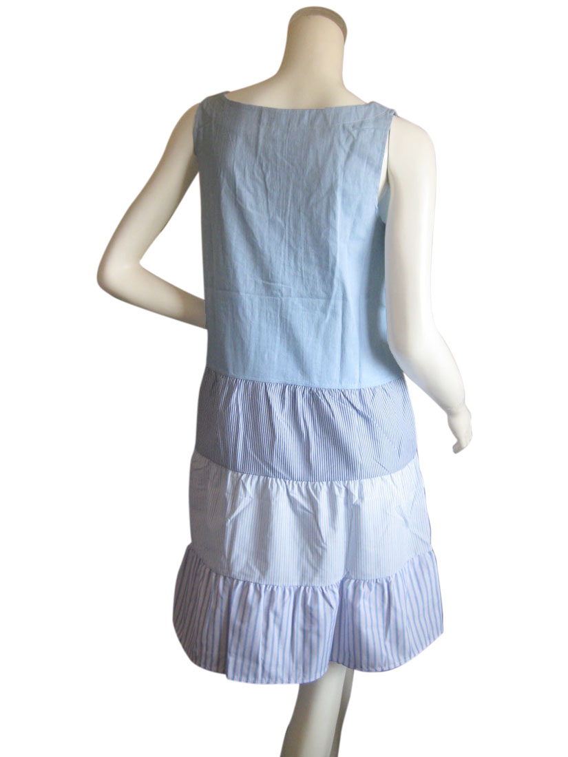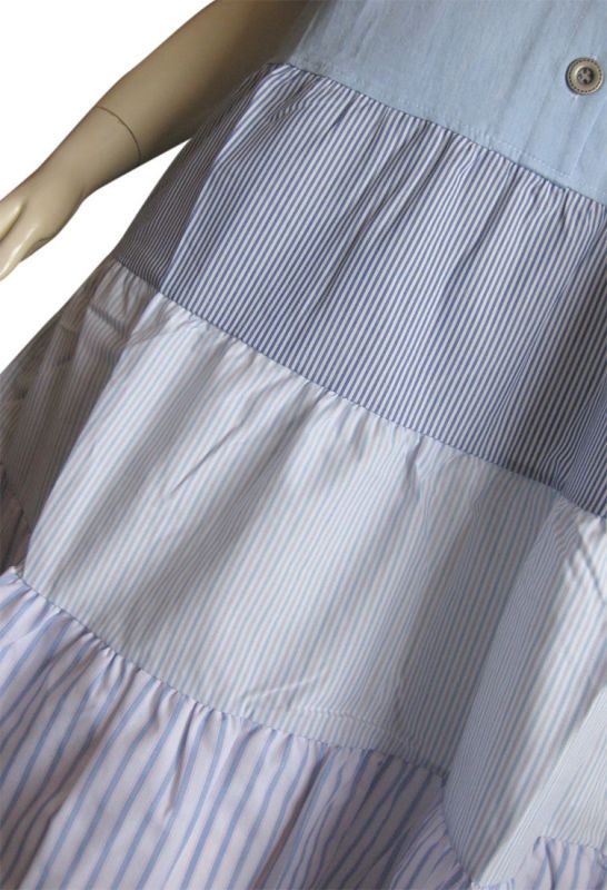 3種のブルー系ストライプ生地のティアード切り替えデザイン。