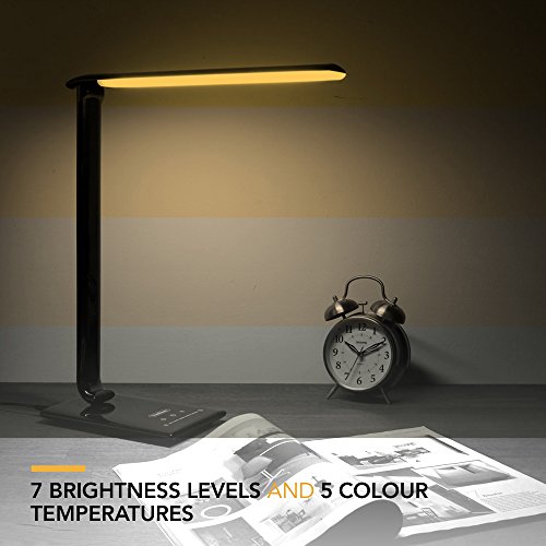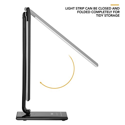-. Feature : Easy to use touch control system with 7 brightness levels and color temperature change feature. Produces a soft, natural light with no flickering, dark spots or computer screen reflection / Adjustable weighted base can be angled and swiveled. Light strip can be moved up or down, and closed and folded completely for tidy storage / Energy efficient with up to 50,000 hours LED life. Uses up to 75% less energy than an incandescent lamp. Built-in timer can be set to switch off automatically after an hour / Integrated USB charging port charges your smartphone, tablet or mobile device / Sleek black design with gloss finish - perfect for the home or office. Mains powered - adapter included