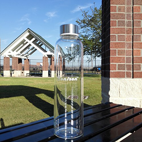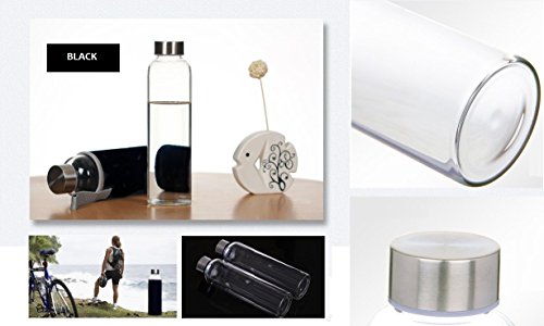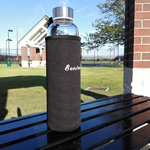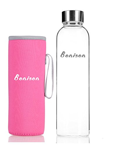 -. Feature : Trendy and High-Quality -- Simplistic, smooth design of BONISON borosilicate glass water bottle is perfectly design for your everyday use. Stay hydrate with fresh, pure taste of water and favorite drink in BONISON clean sleeve glass bottle. / Safety and Improvement -- Made with borosilicate glass, BONISON glass water bottle is TOXIC FREE. The stainless steel with plastic insert lined cap is non-toxic, cadmium-free, lead-free, and made with food-grade materials. Borosilicate glass is more durable and has relatively great temperature tolerance than other traditional glass bottles. Use Caution with Cold Temperatures - Do not overfill by filling completely to the top of the bottle. Do not freeze frozen. / Environmental Friendly -- Bottle is REUSABLE. Easy to clean; dishwasher-friendly, hand-wash is recommanded. / Usage -- Bottle with moderate size (9.4x2.7x2.7in ) that can fit in most bags easily. Item also includes a colorful sleeve that can protect body of bottle, and make product handy to carry around. / Product includes a colorful Nylon sleeve for protection, decoration and greater insulation in temperature of water bottle. Great convenience with attached holding-strap so carrying. Great item for everyday use, indoor/ traveling/ fitness and exercising.