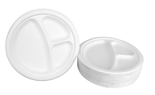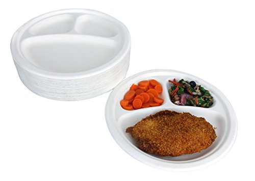 Durable Eco-Friendly 9" Bagasse Plates (3 Compartments) Pack of 100 Round White Plates w/ Dividers - Microwave Safe, Compostable, Made from Sugercane Fibers (100 Count)