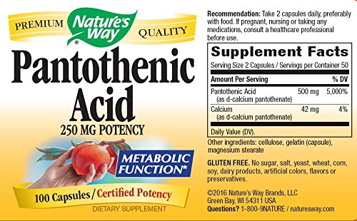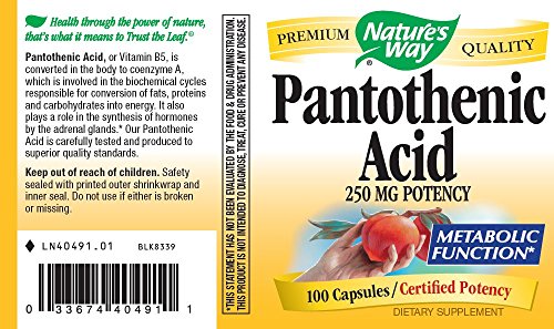 Nature's Way Pantothenic Acid (Vitamin B5) is converted in the body to coenzyme A, which is involved in the biochemical cycles responsible for conversion of fats, proteins and carbohydrates into energy. Pantothenic Acid also plays a role in the synthesis of hormones by the adrenal glands. Vitamin B5 can be used for testicular torsion, diabetic ulceration, hypolipidemic effects, wound healing, hair care, acne, diabetic peripheral polyneuropathy. Some good sources of pantothenic acid are rice, wheat brans, alfalfa, peanut meal, molasses, yeasts, and condensed fish solutions.Feature