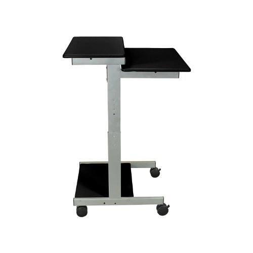 -. Feature : Top shelf dimensions: 34-46H; lower shelf 28.5-40.5H inches / Dimensions: 39.5W x 29D inches / Mobile stand-up work station with steel frame / Durable black laminate wood surface / Powder coat finish on frame