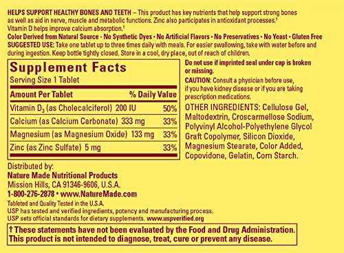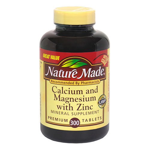 -. Binding : Health and Beauty -. Brand : Nature Made -. Feature : Pack of three bottles, each containing 300 bone-strengthening calcium tablets (900 total tablets) / Recommended for general health, bone/joint health, and weight management / Calcium strengthens bones and may help prevent osteoporosis / Contains 33% RDA of Calcium; 33% of Magnesium; and 33% of Zinc per serving / Magnesium contributes to energy production and bone health -. Label : Nature Made -. Manufacturer : Nature Made -. NumberOfItems : 3 -. PackageQuantity : 3 -. ProductGroup : Health and Beauty -. ProductTypeName : HEALTH_PERSONAL_CARE -. Publisher : Nature Made -. Studio : Nature Made -. Title : Nature Made Calcium and Magnesium with Zinc and Vitamin D, 300 Softgels (Pack of 3)
