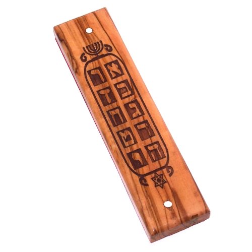 Menorah with Star of David and 10 Commandments Polished Olive Wood Mezuzah ( 4 inches ) - fits 2.5 Inch Klaf
