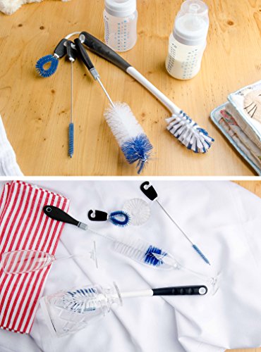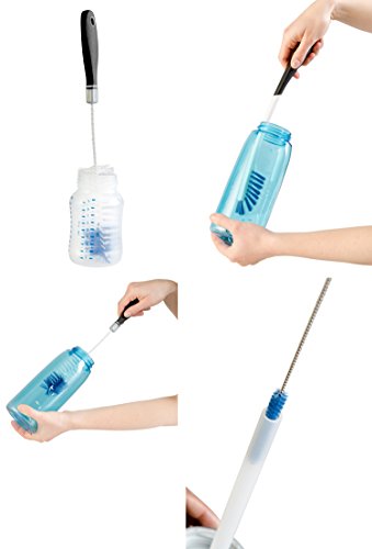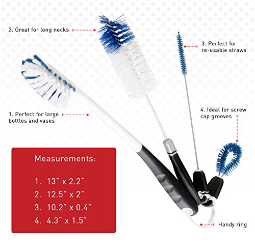 - BOTTLE BRUSH SET OF 4 CLEANING BRUSHES - Includes 1 x long handle bottle brush for cleaning sports water bottles, glassware and wine decanters, 1 x regular bottle brush for baby bottles, beer bottles, tea kettles etc, 1 x small detail cleaning brush, and 1 x narrow straw cleaning brush.