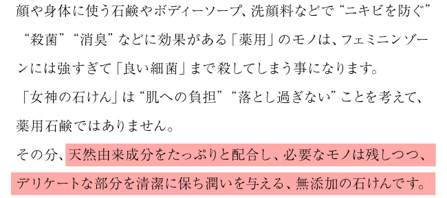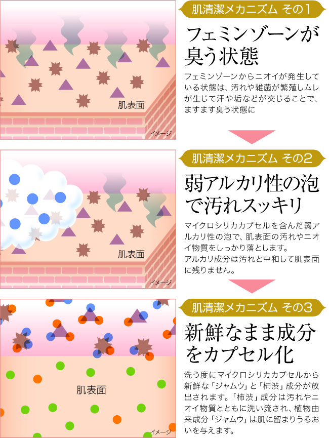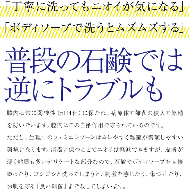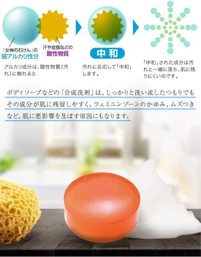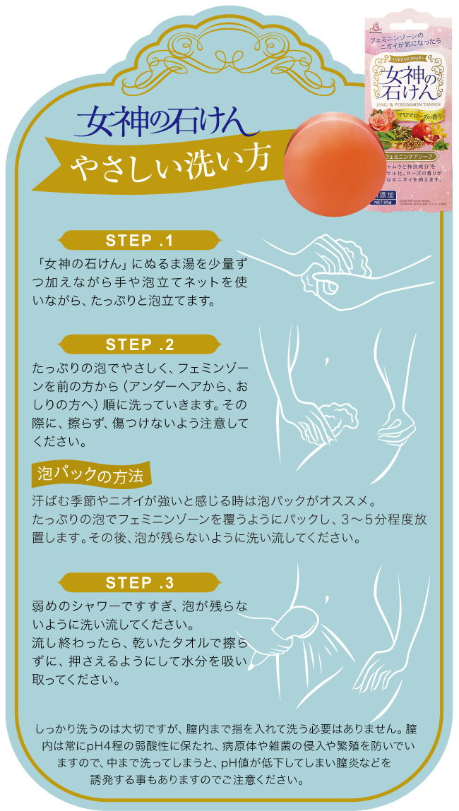 1.石けんにぬるま湯を加えながら泡立てます。 2.擦らずに、やさしく洗います。 3.ぬるま湯で洗い流し、押さえるようにタオルで水分を吸い取ってください。 |