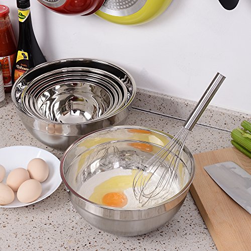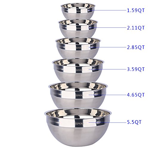 - A deepening basin type with capacity of 1.59, 2.11, 2.85, 3.59, 4.65 and 5.5 quart, this mixing bowl set is ideal for mixing, and no splash will happen.